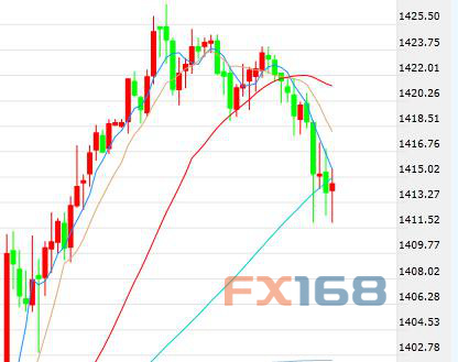 北京时间23:08,现货黄金报1410.60美元/盎司,下跌8.06美元,跌幅0.57%。