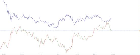 美元指数面临多空交织局面。利空主要是美国经济筑顶并温和回落、美联储货币政策转鸽、美股收益率下滑带来的国际资本流出;而利多主要是美元指数最大的权重对标货币欧元所属的欧元区经济不及美国、全球经济回落下美元的反周期性支撑美元指数、全球资本市场波动加剧背景下美元的避险属性也将支撑美元指数。所以在多空交织的局面下,美元指数近半年来一直维持着震荡格局,而近期欧洲市场的经济数据已经有回稳,如果未来欧洲经济回升,对美元指数来说就是一个较大的利空。