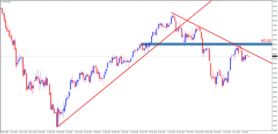备选策略:未建仓投资者可考虑在58.50附近挂单SellLimit,止损60.00上方即可,盈亏比大于2即可离场。